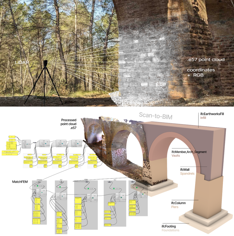 In addition, seven LiDAR scans were conducted to capture high-resolution geometric data. The resulting point clouds were processed to generate the IFC model. Using our Grasshopper plug-in MatchFEM, Computational Design methods were then applied to produce precise IFC geometries.